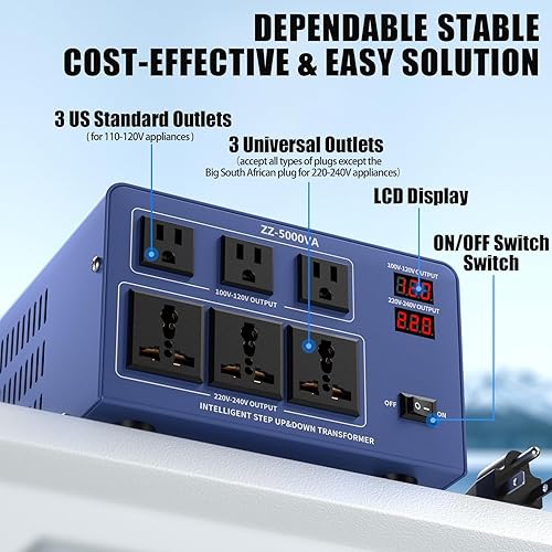 【5000W Voltage Transformer】We provide you a dependable, stable,easy solution.It can step-up voltage from 110-120 Volts to 220-240 Volts or step down voltage from 220-240 Volts to 110-120 Volts. It has 6 AC outlets, including 3 US standard outlets, 3 universal outlets except the Big South African plug for 220-240V appliance(s).The transformer can be used in countries which voltage are 110V~120V or 220V~240V such as US, EUR, UK and more.It is built with 2 LCD displays showing the current output