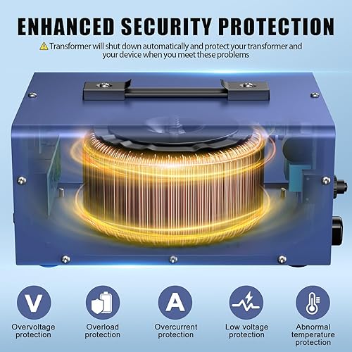 【New Upgrade Self-Developed Automatic Voltage Recognition Chip】Our upgraded voltage transformer can auto recognize the input voltage automatically and then provide the correctoutput voltage for your device.No manual operation required.Which can avoid damaging your converter and appliances when forget to select correct power input source.High efficiency toroidal transformer with stable output and low consumption.This voltage converter transformer adopts high-quality toroidal coils