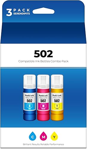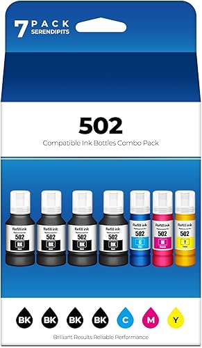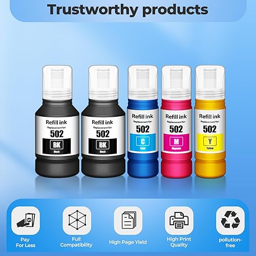 502 Ink Refill Bottles Compatible Printers, compatible with Eco Tank ET-2850, ET-3850, ET-15000, ET-2980, ET-4850, ET-3950, ET-4950, ET-3830, ET-3843, ET-2760, ET-4760, ET-2750, ET-4750, ET-3700, ET-3750, ET-3943, ET-3930, ET-4958, ET-2988, ST-C4100, ET-2700, ST-2000, ST-3000, ET-3710, ET-3760, ST-4000, ST-C2100 502 Printer Ink
