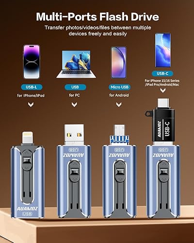 【Multi-Port USB Drive】The 4 IN 1 phone photo stick with USB Port/ USB-L Port/ Micro USB Port/ USB-C Port (Independent interface), which is more convenient for data transfer between different devices, so as to get rid of the data cable and iTunes and iCloud, let you switch easily storage space. The Phone thumb drive is designed for use with a wide range of devices, Compatibility iPhone 16/15/14/13/12/11/8/7/6S/SE/XR/XS/XS Max/X Series/iPad Air Series/iPad Pro Series. Also support Android smartphones/Computers and other devices with USB-C Ports. (Tip: For iPhone system version requires iOS 13 or higher, For Android smartphones need to open OTG function)