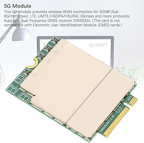 5G Module: This 5G module provides wireless WAN connection for 5GNR (Sub 6G/mmWave), LTE, UMTS (HSDPA/HSUPA), Glonass and more protocols. Supports dual frequency GNSS receiver DW5932e. (This card is not compatible with Electronic User Identification Module (EIMD) cards.)