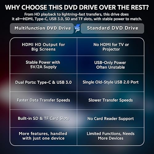 【All Region Free & USB/TF Card Input】Our Region Free external cd drive Players can play standard discs from all countries, supports CD, DVD, DVD±R, DVD±RW, CD-R/-RW, VCD, SVCD, KODAK PICTURE & PHOTO CD; USB /TF card input supports playing MPEG-1V, MPEG-2V,H. 263, XVID, DX50, DIVX, , WMA, AC3, PCM, JPG ( max to 32GB with FAT32 format). Note: Do not support blue-ray disc and MP4 files.