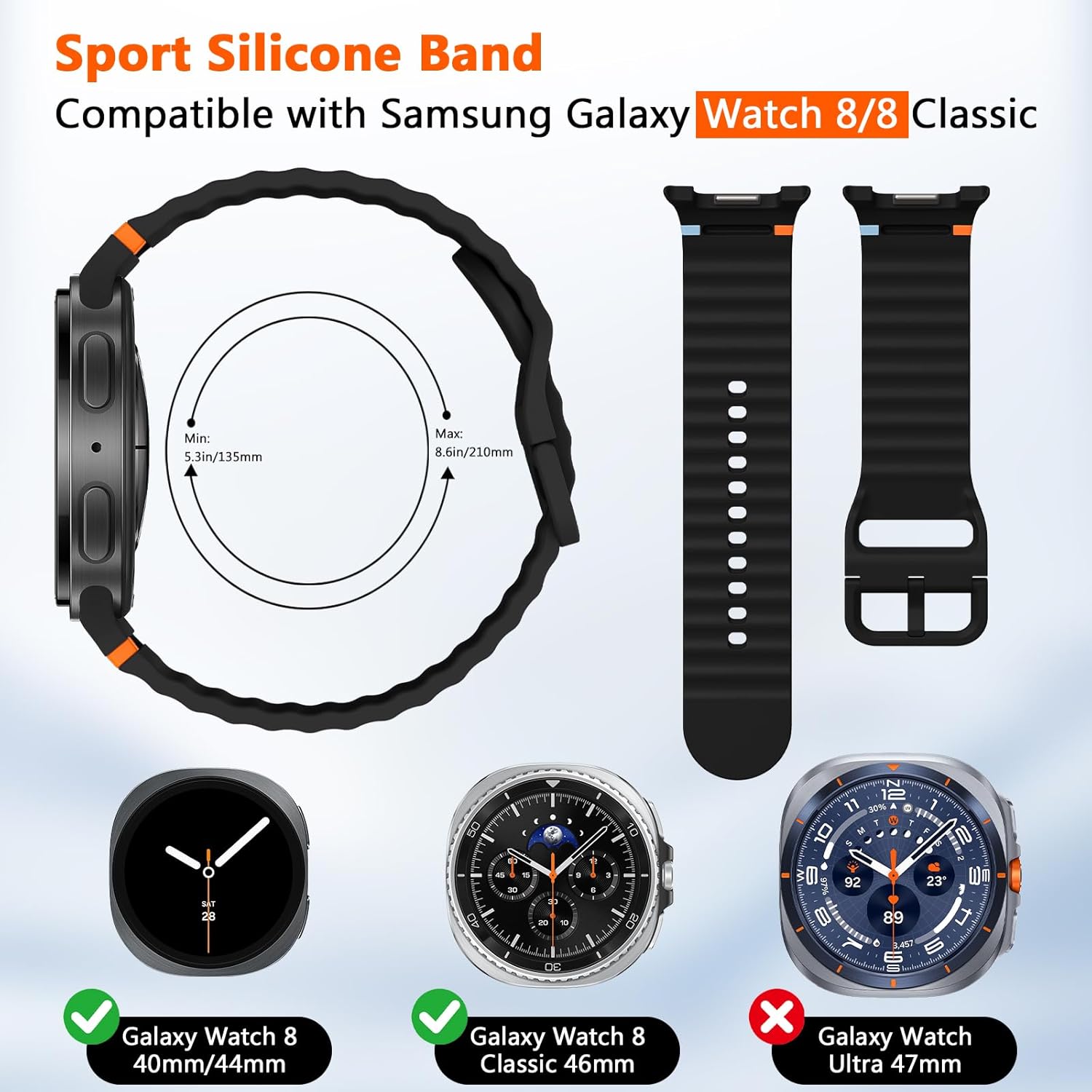 【Premium Silicone Material】The galaxy watch 8 classic band is made of premium soft silicone rubber, soft, skin-friendly, lightweight, flexible, comfortable and breathable, durable, no irritation to the skin, odorless, waterproof, sweat-proof and quick-drying, perfect fit for your Galaxy Watch 8/8 Classic. Ideal for workouts, exercise and outdoor activities
