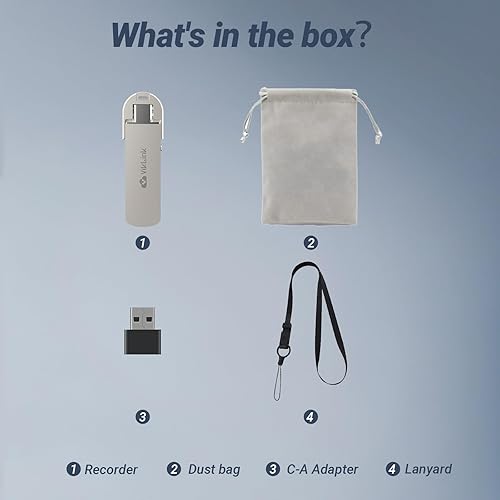 【Package Contents & Safe Time-Setting File】 Includes 1× Viklink voice recorder (with a built-in time-setting file for setting accurate date and time), 1× USB-C to USB-A adapter, 1× soft carrying pouch, 1× lanyard, and 1× user guide. The built-in file may be flagged by some computers as a security warning, but it is completely safe and virus-free.
