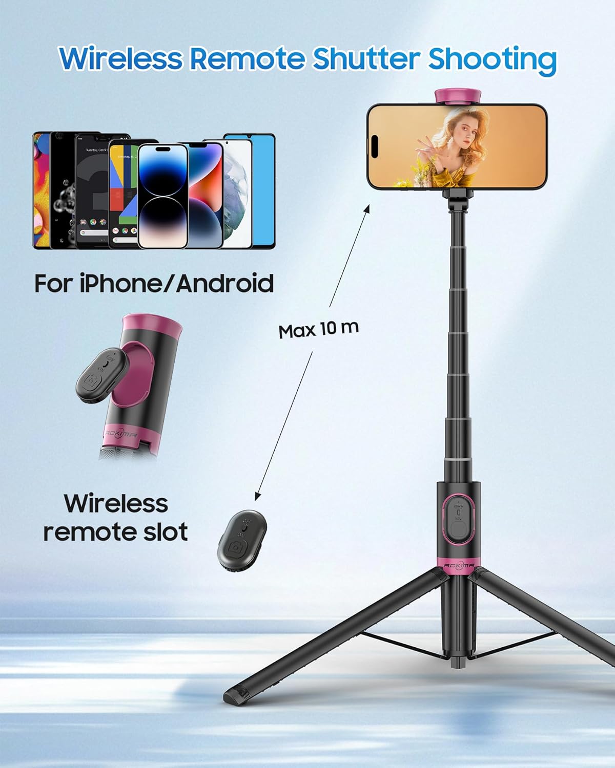 Detachable Wireless Remote: Equipped with a detachable wireless remote control, our selfie stick tripod breaks the barriers of shooting distances, supporting a maximum range of 33 feet. It is compatible with iphone/Android, quickly realizes pairing. When the remote control is not in use, it can be placed in the dedicated remote control slot on the iPhone selfie stick handle to prevent it from being lost