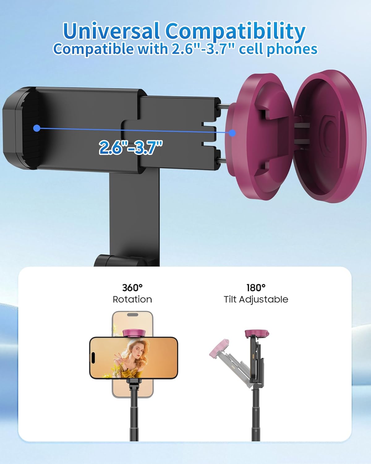 360° Rotating Phone Holder: This selfie stick tripod is easy to maneuver into position, 360° left and right and 180° forward and backward rotation, It allows you to find the best angle you need. Fits all smartphones (2.6–3.7 wide), Moreover, the phone holder is well wrapped with non-slip silicone pads to protect your mobile phone better