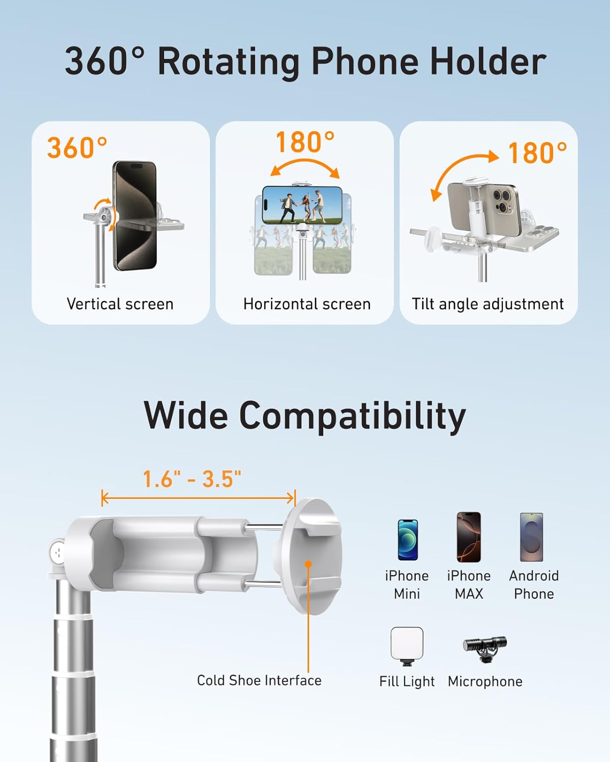 【Phone Tripod Built-in Cold Shoe Mount】: Features an integrated cold shoe mount directly on top of the travel phone holder, allowing you to easily attach essential accessories like an external microphone (mic) or video light for enhanced audio and professional lighting while filming hands-free or capturing selfies. Upgrade your vlogging gear seamlessly.