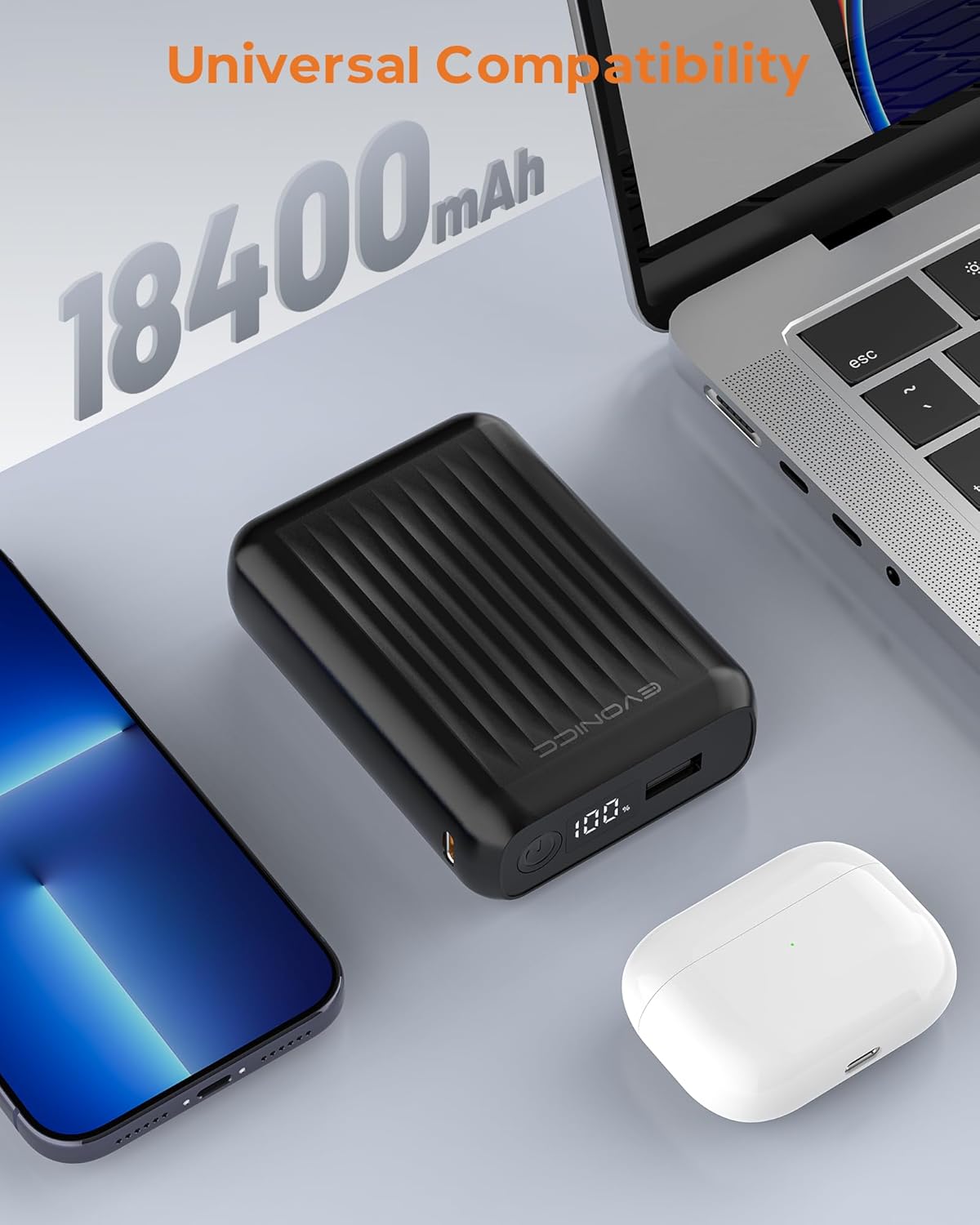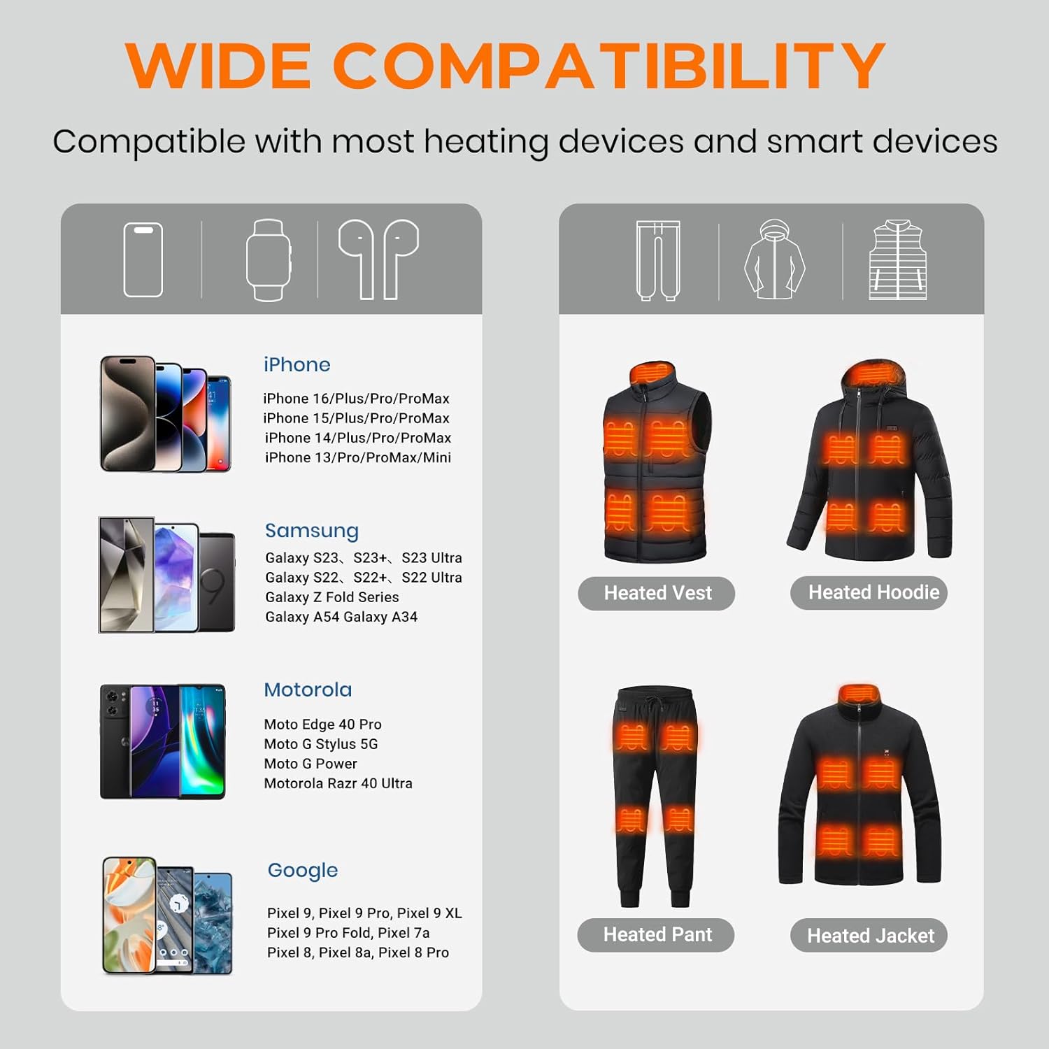 LONG LASTING WARMTH: Compact and powerful, 18400mAh large capacity provides long-lasting power for your heated clothing. (5–6 hours on high, 7–8 hours on medium, and up to 10–12 hours on low). One charge can meet your daily use needs for a day. Whether you're commuting, working outdoors, or enjoying winter sports, you can count on all-day warmth.