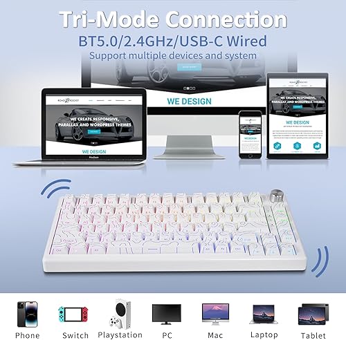 【Tri-mode Connection Keyboard】 CK621 wireless mechanical keyboards work with Bluetooth 5.0, 2.4GHz wireless and USB wired connection, can connect up to five devices at the same time, and easily switch by shortcut keys or side button. This computer keyboard is suitable for PC, laptops, tablets, mobile phones, PS, XBOX etc, to meet all the needs of users. In addition, the rechargeable keyboard is equipped with a 4000mAh large-capacity battery, which has long-lasting battery life