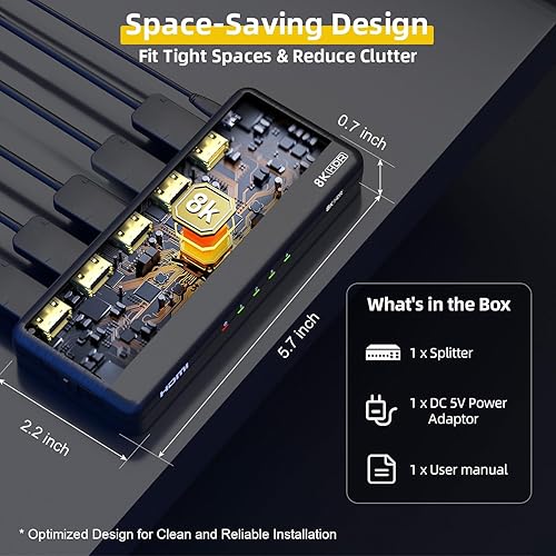 8K Ultra HD Support: Delivers resolutions up to 8K@60Hz, 4K@120Hz, and 1080p@240Hz; supports HDMI 2.1, HDCP 2.3, HDR10, HDR10+, Dolby Vision, HLG, 3D, CEC, and 7.1 surround sound with 48Gbps bandwidth (Does not support Sonos ARC / E-ARC; Only Output-1 on the splitter supports CEC passthrough.)