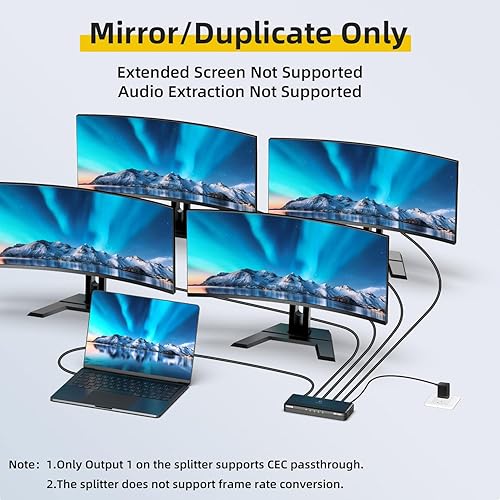 4 Port HDMI Splitter: Distributes HDMI video and audio from a single source to four displays simultaneously without signal degradation; supports duplicate/mirror mode only (Does not Support for extended screens)