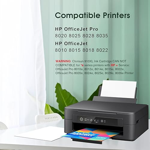 Note: Clorisun Compatible for hp 910xl ink cartridges combo pack CAN NOT COMPATIBLE for "e" series printers with HP + Service. Please note that printer firmware updates can block compatible cartridges from working. To keep compatible for hp 910xl ink cartridges combo pack working correctly, you can ignore firmware update reminders. If your printer is one of: 8010e / 8012e / 8014e / 8015e / 8022e/8020e / 8024e / 8025e / 8028e / 8035e