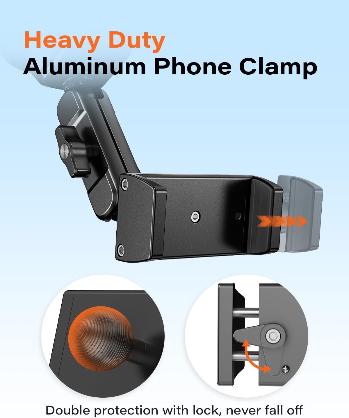 Alloy Clamp with Secure Lock & All-Round Protection: The phone clamp is constructed from durable aluminum alloy, ensuring long-lasting performance. A unique rear locking mechanism secures the clamp in its closed position, providing double insurance against accidental opening. The clamping arm is equipped with soft, shock-absorbing silicone air cushions, safeguarding your phone against bumps and jitters from the road.
