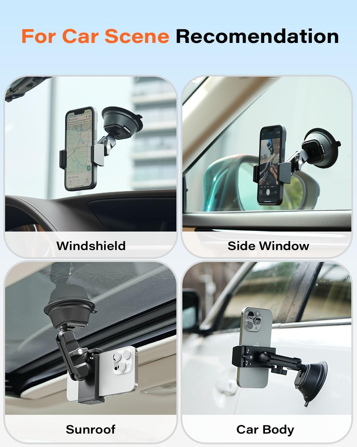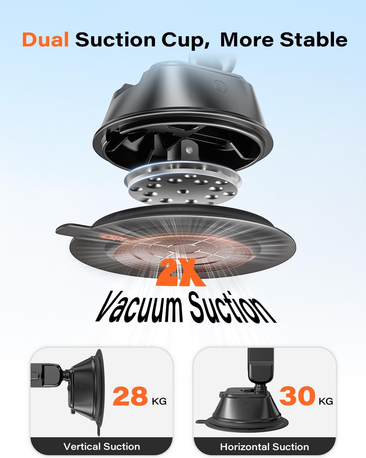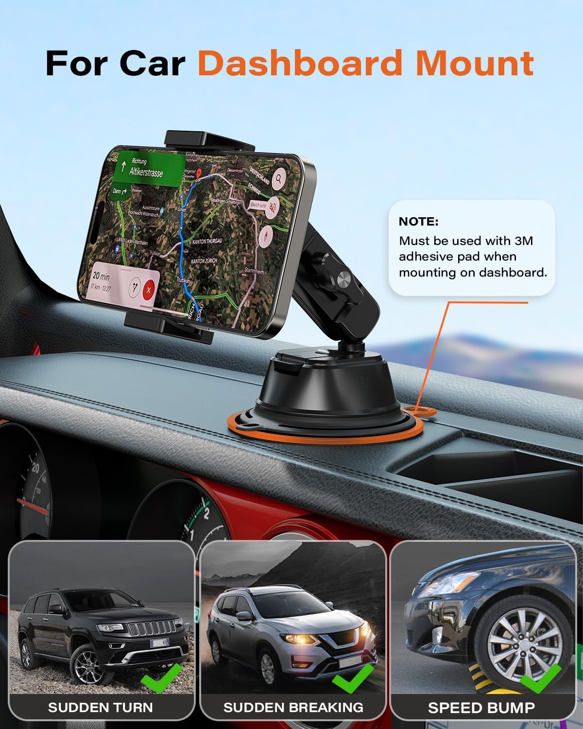 Ultra-Strong Suction Cup Mount: Experience unparalleled stability with our car phone mount's revolutionary dual-layer suction cup, boasting an incredible 30kg pulling force. It absorb firmly to windshields or glass surfaces without leaving residue. For dashboard installation, just use with the included 3M VHB tape. This suction phone mount offers a reliable mounting solutions for a rock-solid grip on bumpy roads.