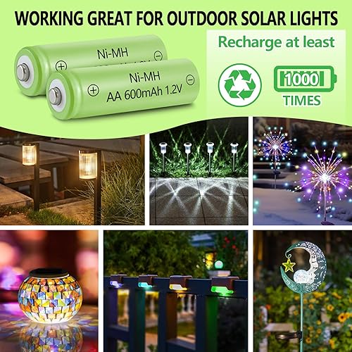 【Rechargeable AA batteries】: 1.2V Ni-MH AA Rechargeable Batteries with 600mAh real capacity, keep your solar light working for long time after full charge.
