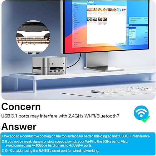 【Stable Wi-Fi, Reduced Interference】The dock is equipped with internal conductive shielding that helps reduce 5GHz Wi-Fi interference—even when using high-speed 10Gbps USB-A ports. This design supports more stable wireless performance, allowing for smoother streaming, video calls, and large downloads with fewer interruptions.