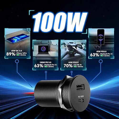 100W Ultra-Fast Charging: The Acegoo 12V USB Outlet is equipped with a blazing-fast 100W USB-C port, charging laptops from 0 to 40% in just 30 minutes—350% faster than standard 30W chargers. It’s perfect for high power-hungry devices like power banks, laptops, and drones. Say goodbye to long waits when you're on the go