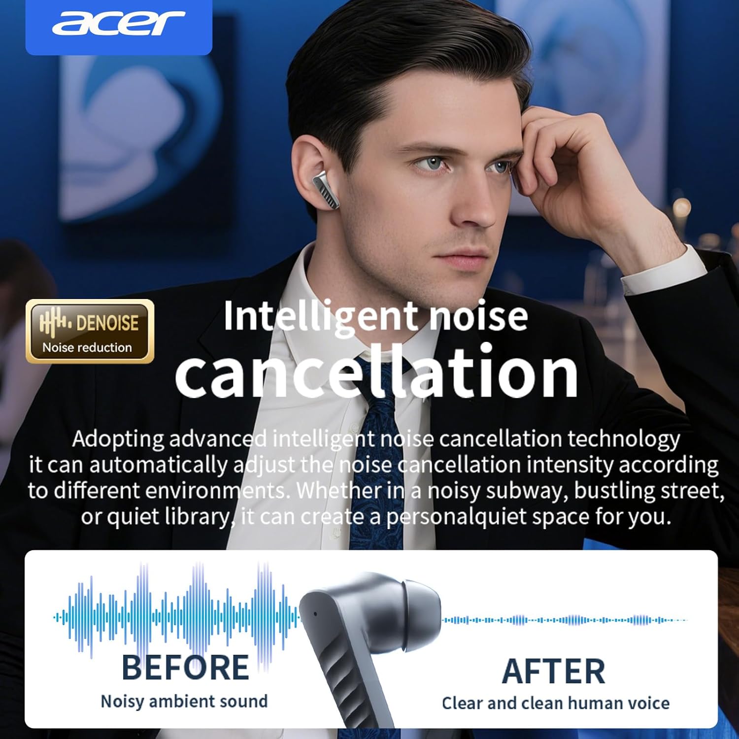 acer Wireless Earbuds Bluetooth Headphones, Hi-Fi Stereo Sound, Long Battery Life, Noise Cancelling with Charging Case for Sports & Working, Stereo Sound Headphones for iPhone/Android/iPad