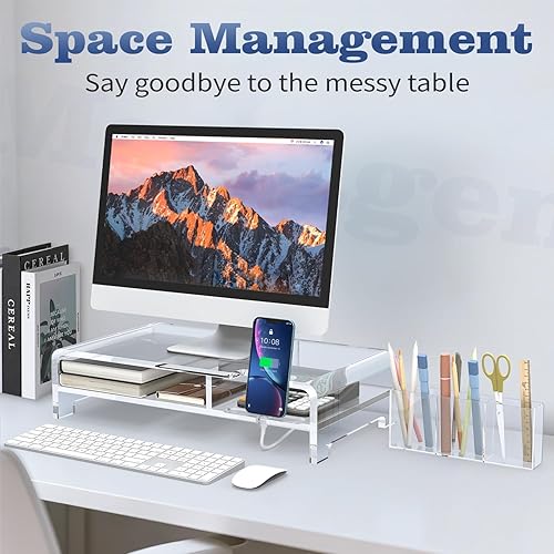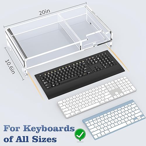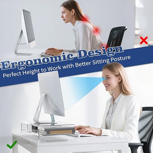 Dual-Tier Acrylic - Our 2 layer acrylic monitor riser (20"Lx10.6"Wx4.8"H)can elevate your monitor to an ergonomic 4.8in/12cm height , while the spacious 2.4in/6cm lower tier neatly stores keyboards, notebooks or calculators. This acrylic laptop stand for desk maintains a clutter-free, airy desktop aesthetic without installation,so you can start using it right away to save space for your desk.