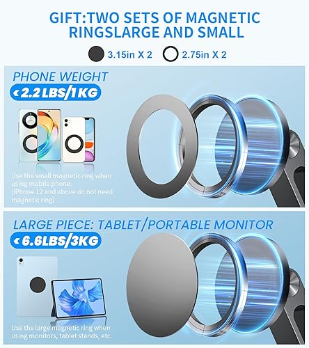 【Applicability】: 6.5-inch-18.5-inch portable display (please confirm that your device weighs less than 6.6 pounds and there is a flat area in the middle of the back that can be adsorbed), compatible with iPhone (12-16 series) Perfect fit for almost all tablets/iPads (without protective case, use the included metal ring). For devices that cannot be directly magnetically adsorbed, use the metal ring to ensure secure adsorption. Maximum load: 6.6 pounds/3 kilograms. We provide large metal rings (maximum load: 3 kg/6.6 pounds) and small metal rings (1 kg/2.2 pounds).