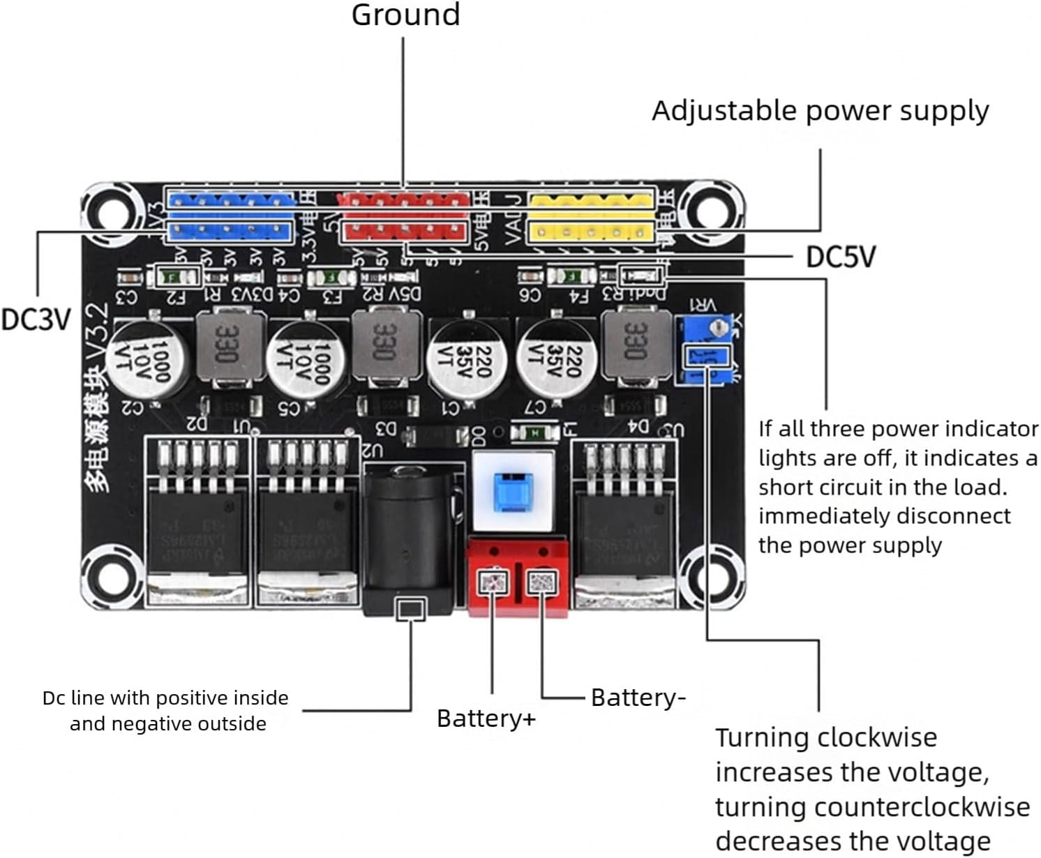 High efficiency step down converter module with adjustable 3.3V/5V output, featuring voltages regulator chips and quadruple 2A selfs resetting fuses for stable power supply and overload protections in electronic projects.