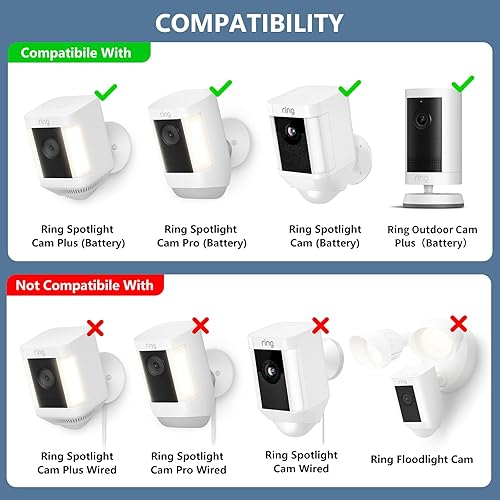 Compatibility:This mount is compatible with Ring Spotlight Cam Plus/Pro (Battery) and Ring Stick Up Cam/Pro (Battery), and also compatible with Eufy Cam, Reolink Argus, Arlo, and other security cameras featuring a standard 1/4 threaded hole