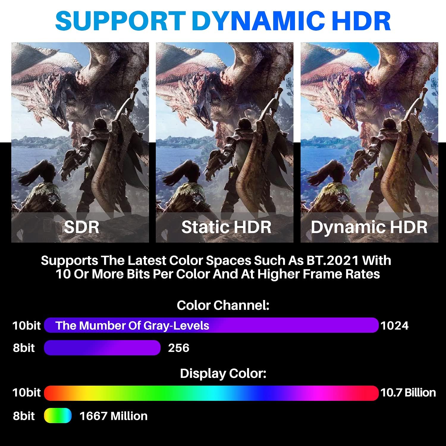 【48Gbps Super High-Speed Data Transfer】Adoreen 8K HDMI 2.1 Cable Supports Dynamic HDR formats and bandwidth capability is increased up to 48Gbps.It Supports HDCP2.2 when using HDCP2.2 video source, 48 bit/px HDR color depth, enchanced Audio Return Channel (eARC), Variable Refresh Rate (VRR) and Quick Frame Transport. Compatible with HDMI 2.0b/2.01/2.0/1.4/1.3/1.2/1.1