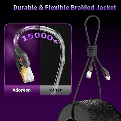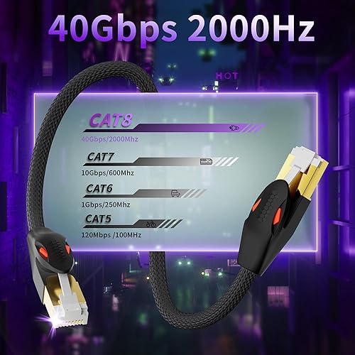High Performance: 26 AWG 100% pure copper conductors ensure optimal signal transmission efficiency----Gold-plated RJ45 connectors enhance shielding, resist oxidation/corrosion, and boost stability for long-term high-speed data transfer----Supports 2000 MHz bandwidth and speeds up to 40 Gbps, optimized for gaming/streaming to significantly improve upload/download speeds, audio/video quality, and resolution----4-pair S/FTP cable with multi-layer shielding minimizes interference, noise, and crosstalk for faster, more stable networks