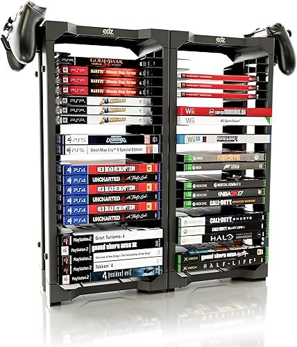ADZ Universal Game Holder – 46 Game Storage Tower Rack for PS2 PS3 PS4 PS5 PSP Xbox 360 Xbox One Series X Wii Switch Games DVD and Blu-Ray Disks. Includes 2 Controller Mounts (Black)(White)
