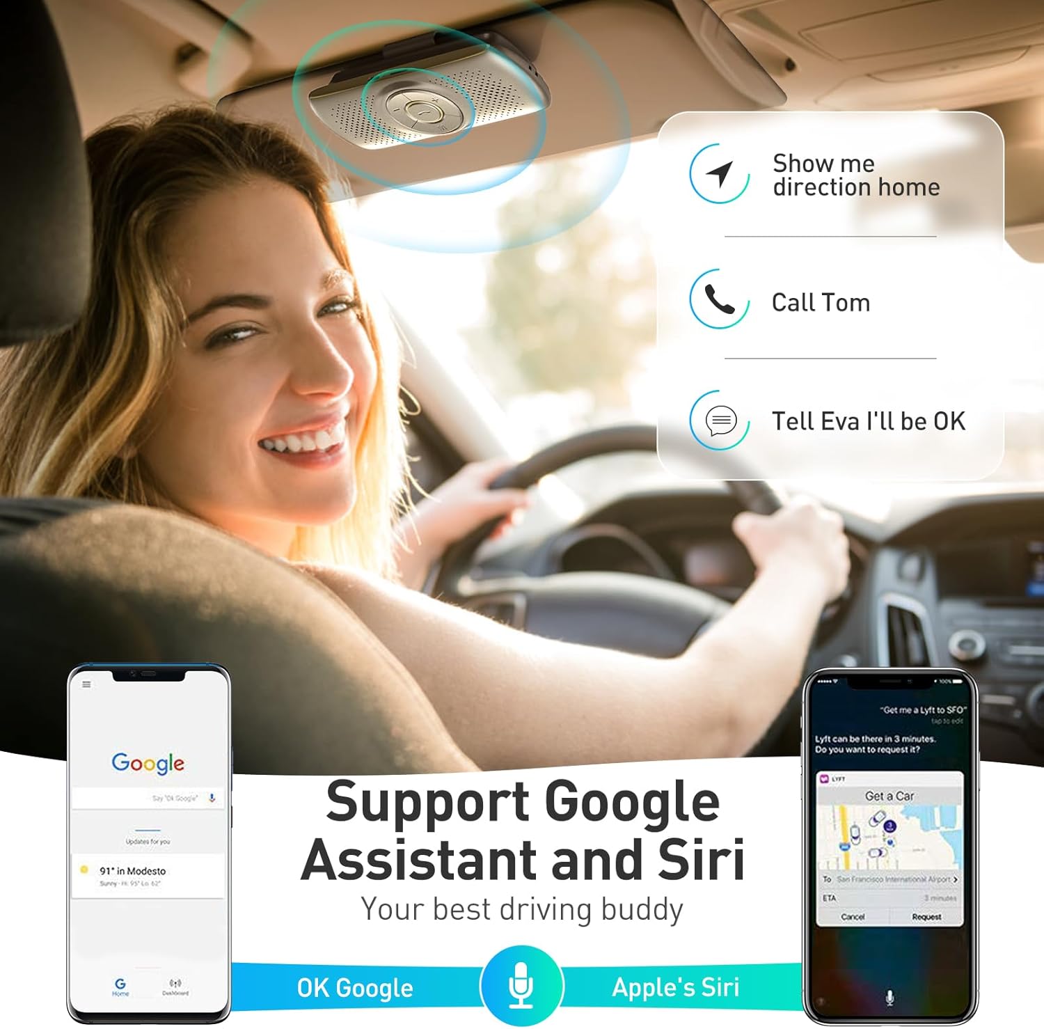 【BLUETOOTH 5.3 SPEAKER FOR CAR】Bluetooth 5.3 stable and fast connection, supports automatic shut-off and reconnection. Double click the M button of the hands-free kit, activate Siri or Google Assistant, help answer calls or SMS or retrieve a route, safer while driving
