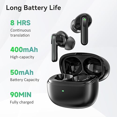 【Long Battery Life】This translation earbud is equipped with a 100mAh high - quality battery, enabling it to work continuously for 10 hours. The charging case of the earbuds is equipped with a 400mAh high - quality battery, and with the charging case, it can be used for up to 30 hours. You can take it with you wherever you go without worrying about running out of battery. Moreover, it has advanced noise cancellation and unique speakers, so it can achieve accurate real - time speech recognition even in noisy environments. This translation device is ideal for travel, foreign language learning, and business trips.