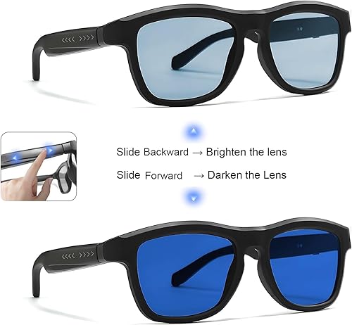 Slide-to-Change Smart Lenses & UV400 Protection Gently slide your finger along the temple to smoothly transition between clear indoor lenses and dark outdoor sunglasses. Enjoy 99% UV400 protection for driving, cycling, running, or beach days. It's the intuitively controlled smart glasses solution for any environment.