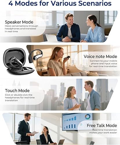 INSTANT EARBUD TRANSLATOR IN REAL TIME Translating earbuds real time with near-zero latency. Supports translate earbuds real time and 4-mode flexibility. 30-hour battery ensures uninterrupted ai headphones language translation sessions.