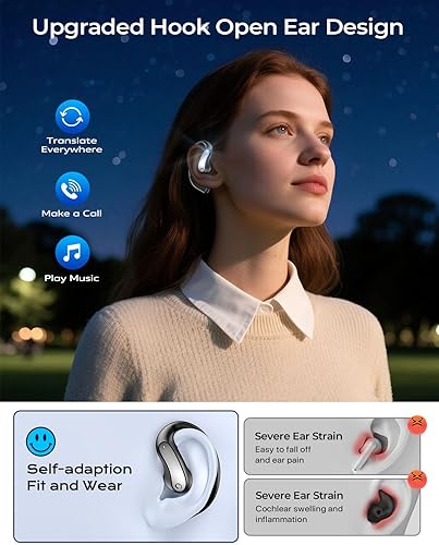 3-IN-1 MULTIFUNCTIONAL TRANSLATING EARBUDS Combines translator earbuds functionality, HD music, and calls. Bluetooth 5.4 connects to iOS/Android. Ergonomic OWS design enhances comfort for extended use as translation headphones.