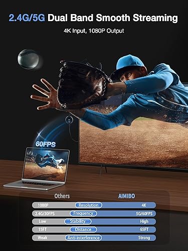 【Dual Band 2.4G & 5.8G for Uninterrupted Streaming】Unlike other wireless display adapters on the market that only support 2.4G, our HDMI wireless adapter utilizes both 2.4G and 5.8G frequencies delivering smoother and faster streaming. Whether you're giving a critical presentation, enjoying your favorite movies, or engaging in a video conference, AIMIBO dongle ensures a stable, high-speed connection with zero latency, keeping you connected and productive in any scenario