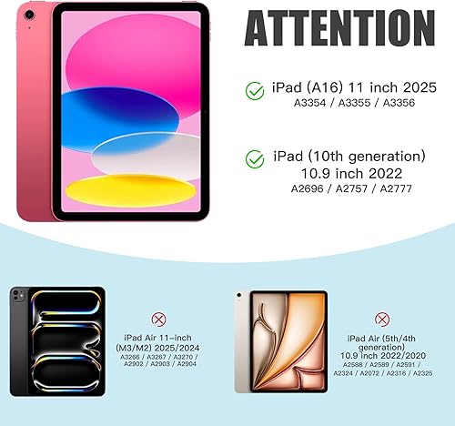 【Compatibility】 Akkerds case is designed for iPad A16 11th Generation 11 inch 2025 (Model: A3354 / A3355 / A3356) and iPad 10th Generation 10.9 inch 2022 (Model: A2696 / A2757 / A2777). Not compatible with any other devices. Please check the back bottom of your tablet to find the model number