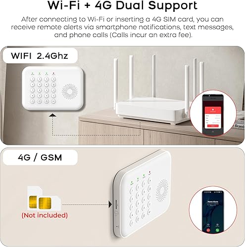 【2.4GHZ WiFi + GSM/3G/4G Dual Network Mode】You can use WiFi or GSM/3G/4G network, please note that the WiFi only can work with 2.4GHz and 5G SIM cards are not supported. Receive remote alerts through smartphone notifications, text messages, and phone calls (calls require an additional fee).