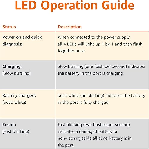 LED Light Indicator: 1) Battery is charging: LED blinks slow. 2) Battery is fully charged: LED is solid white. 3) The charger detects an error (defective battery or alkaline battery): LED blinks fast. 4) Every time the charger is connected to power all LEDs power up and power off in a quick sequence.
