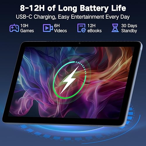 The Battery That Lasts All Day & Then Some - The powerful 6000mAh battery delivers up to 12 hours of mixed use—perfect for a full day of daily use, keeping boy and girls entertained on long trips, or binge-watching your favorite shows at night. Spend less time tethered to an outlet and more time enjoying your 10.1 inch android tablet. Enjoy a full day with a full charge!