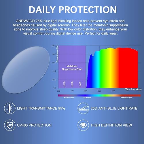 OVERAL BLUE BLOCK RATE: 99.9% - ANDWOOD Blue Light Blocking Glasses come with anti-glare and anti-reflective coatings that cut down on screen glare and brightness. Enhances viewing comfort and focus, allows you to focus on your game or task at hand, improved performance and productivity.