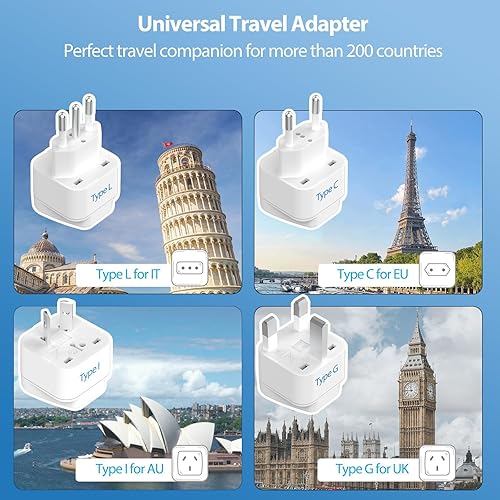 Travel Voltage Converter: The 220V to 110V converter adapter combo equipped 1 DE power cable and 4 International adapters (type C G, I, L); it's your good travel companion across United Kingdom, European, Italy, Australia, France, Germany, Spain, Greece, South Korea, Netherlands, Norway, Poland, Portugal, China, Dubai, England, Fiji, Hong Kong, Ireland, Argentina, New Zealand Russia etc, more than 200 countries over the world, ideal for charging your multiple devices when traveling abroad