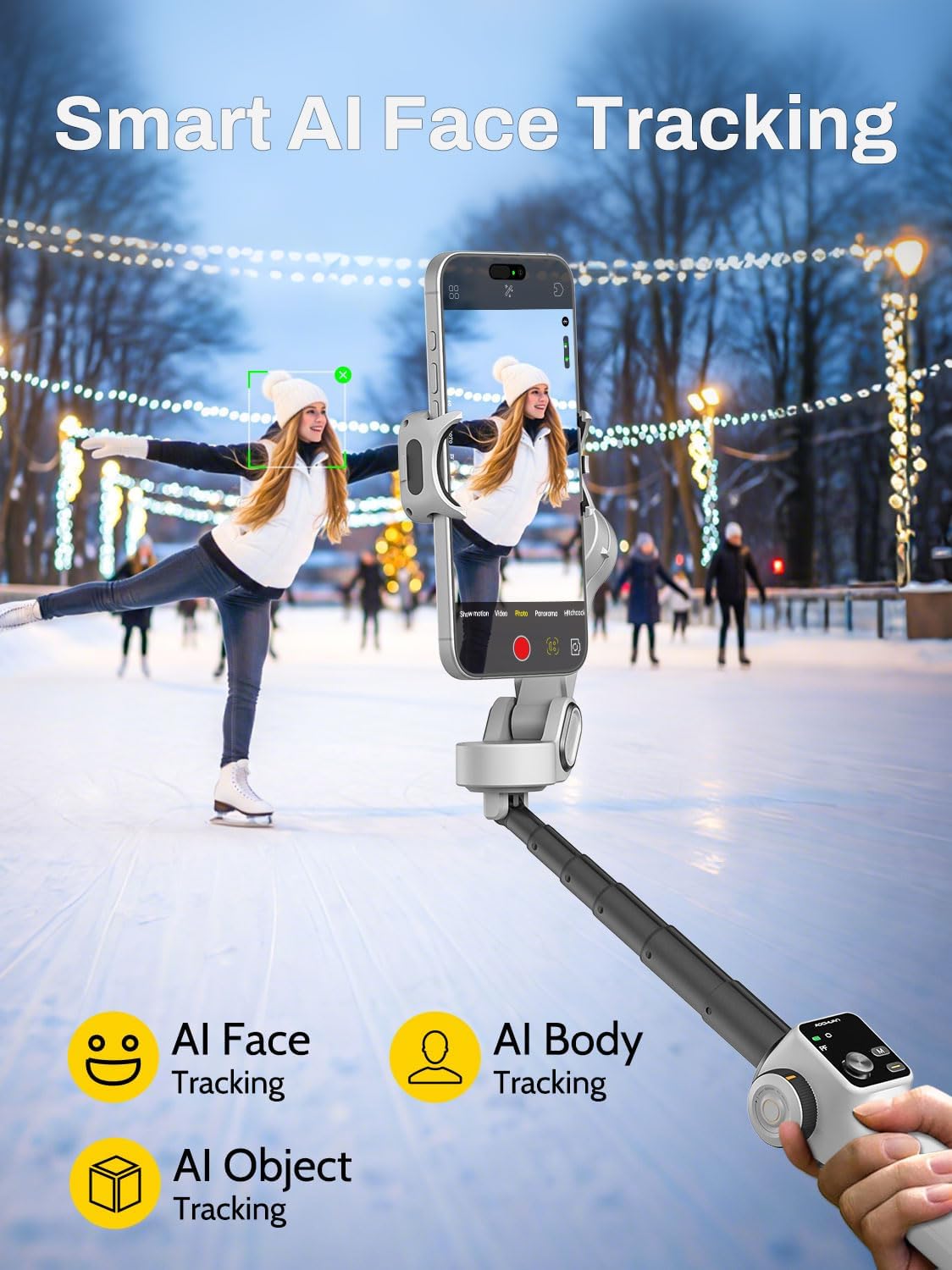 AI Face Tracking for Perfect Framing: With intelligent AI face tracking, the Smart V8 gimbal for iPhone keeps you or your subject centered in the frame. Essential for vlogging, interviews, YouTube creators, and solo shooting, ensuring reliable framing without assistance.