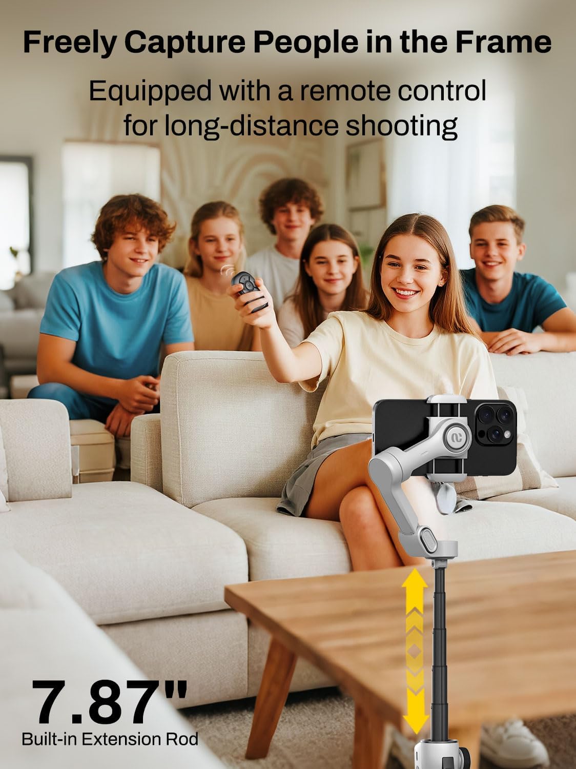 Built-in Extension Rod for Creative Angles: The 7.8” extension rod lets you capture high, low, or wide shots without extra gear. Its all-in-one design makes it perfect for group selfies, travel vlogs, TikTok videos, YouTube content, and unique solo shooting angles with this smartphone gimbal stabilizer.