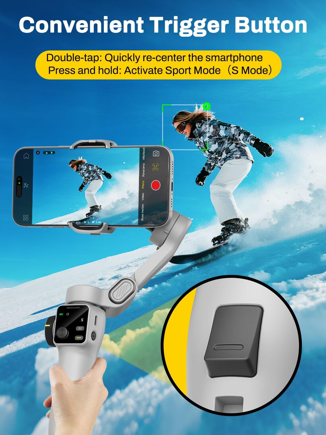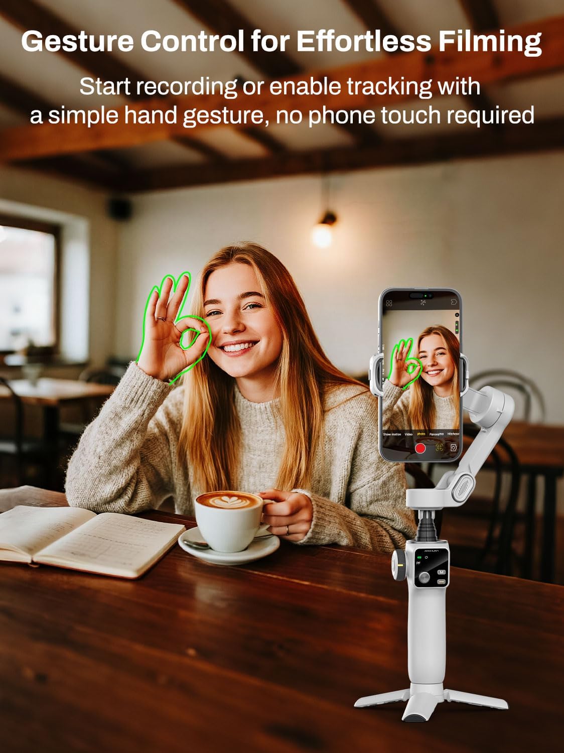 Gesture Control for Effortless Shooting: Smart V8 phone stabilizer lets you activate recording or enable tracking with simple gesture control. Combined with the Bluetooth remote, this feature ensures effortless operation whether you’re in front of the camera or behind it.