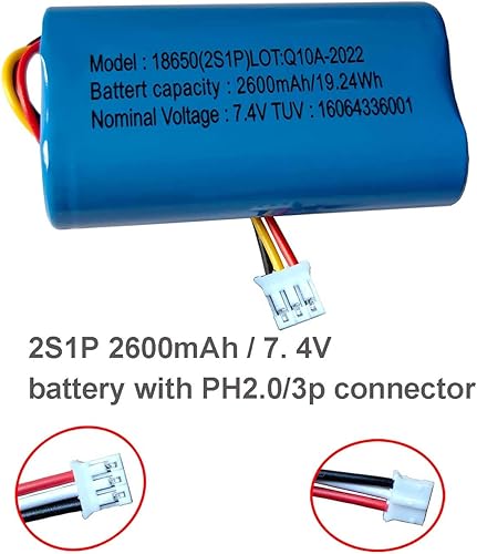 This 7.4V rechargeable lithium-ion battery is composed of 2 balanced 2600mAh cells, with a total capacity of 7.4V 2600mAh, These batteries are connected in series and spot-welded to a protection circuit.