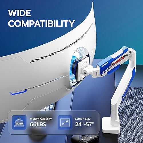 ARES WING Heavy Duty Ultrawide Monitor Arm - Gas Spring Aluminum Monitor Mount with USB for 24"-57" Curved Screens up to 66 lbs with Clamp/Grommet Desk Mount, 75/100/200 Vesa Mount, White(white)