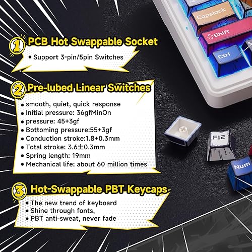 Hot Swappable Keyboard & Pre-lubed Linear Switch: Enjoy the fun of making your own unique keyboard.The switches and keycaps can be freely replaced(keycap/switch puller are included in the package).Hot-swap PCB allows you to replace 3 pins/5 pins switches freely without soldering issue.