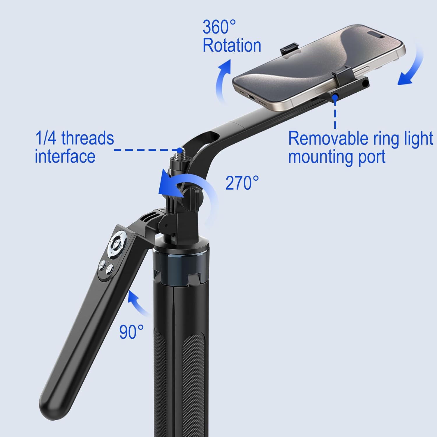 360 °Rotation and Remote Control: 360°Tripod for cell phone rotating with remote supports 270° vertical rotation and 360° horizontal rotation, making it ideal for portrait and landscape shots. The telescoping pole extends to 70.9 inches (180 cm) and collapses to 13.8 inches (35 cm), offering great portability and folds compactly for convenient travel. Perfect for close-up shots, panoramic photography, remote selfies, or phone mounting, it suits both professional photographers and everyday users. The selfie stick is equipped with a seven-button detachable remote, supporting remote shooting up to 33 feet (10 meters), making one-button shooting easy and ideal for personal use.