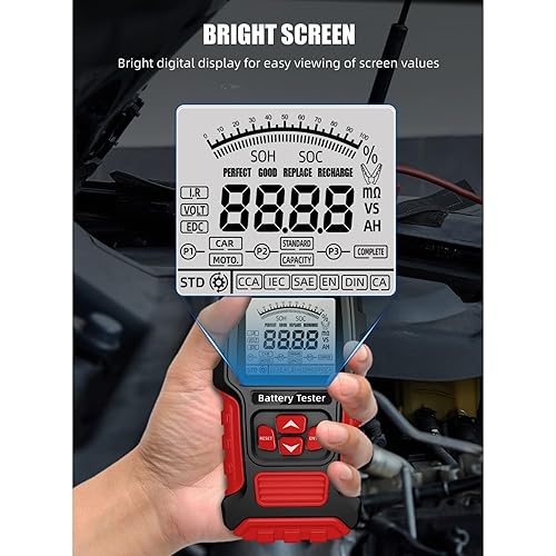 COMPREHENSIVE TESTING FUNCTIONS** = Measures State of Health (SOH), State of Charge (SOC), Cold Cranking Amps (CCA) value, and Internal Resistance (IR) for thorough diagnostics, helping you make informed decisions about battery maintenance or replacement.