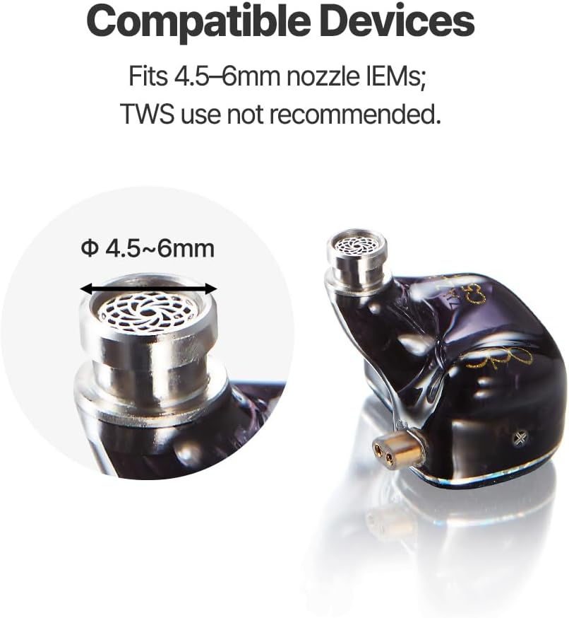 5. Universal Compatibility – Compatible with IEM tips sized for 4.5–6 mm nozzles; ideal as earbud tips for wired earbuds, in ear monitor earphones, and more.